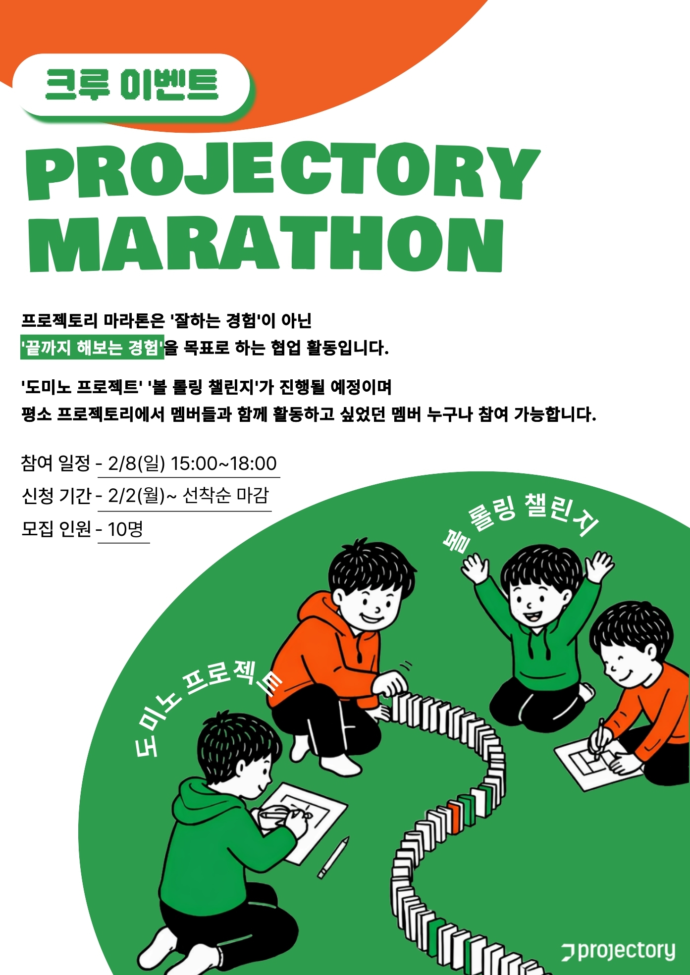 크루 이벤트 프로젝토리 마라톤은 '잘하는 경험'이 아닌 '끝까지 해보는 경험'을 목표로 하는 협업 활동 입니다.